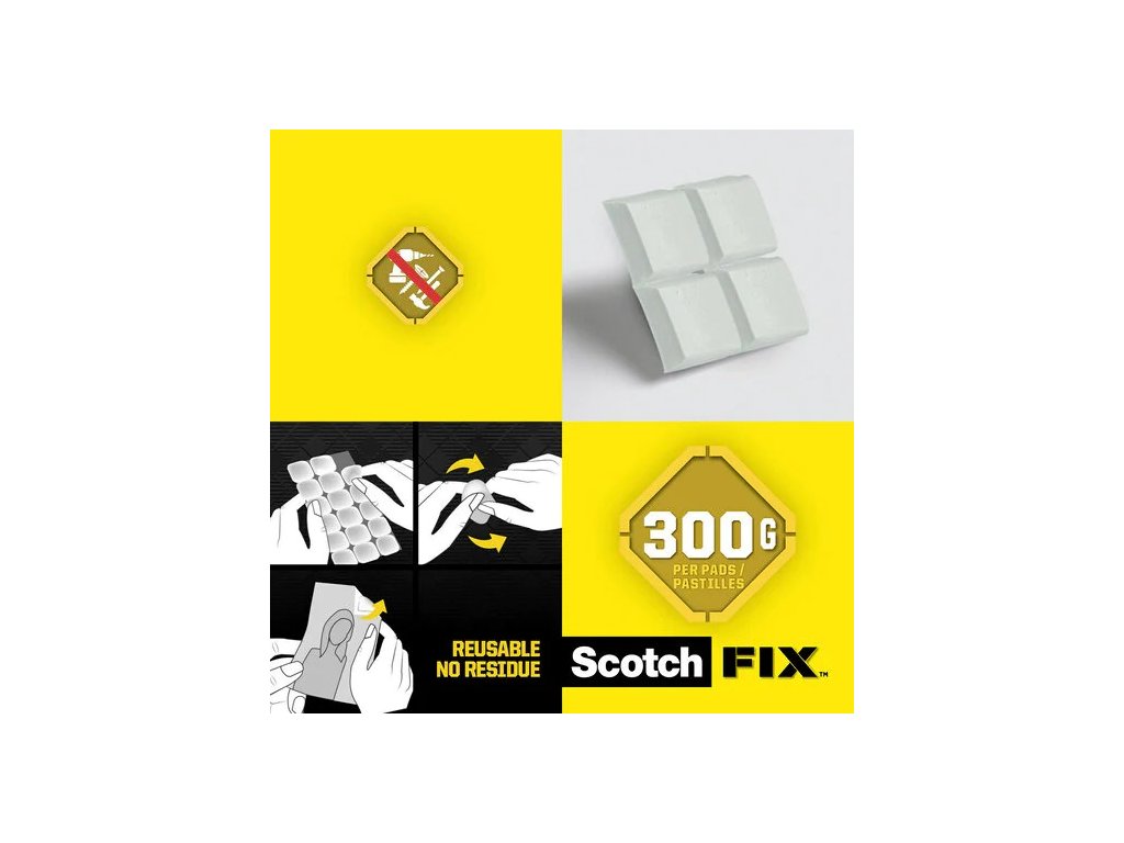S odnímateľnými lepiacimi podložkami Scotch-Fix™ zmeníte dekoráciu tak rýchlo, ako vám napadne. Ideálne na nalepenie obľúbeného plagátu, fotografie alebo umeleckého diela. Ľahko sa pripevňuje na rôzne povrchy - dokonca aj na drsné, natreté parapety. Tvarované podložky sa dajú ľahko odstrániť z predmetu a povrchu a možno ich používať znova a znova. S odnímateľnými lepiacimi podložkami Scotch-Fix™ si môžete prispôsobiť veľkosť lepiacej plochy. Podložky tiež nezanechávajú na povrchoch biele ani žlté zvyšky. Nehrozí poškodenie vašich maľovaných stien alebo tapiet.