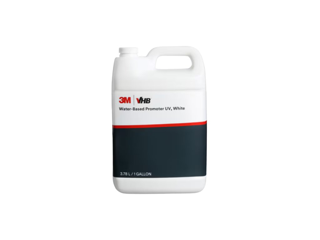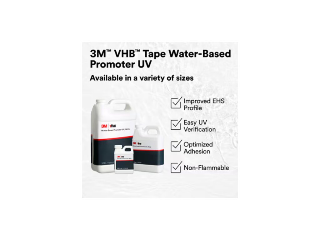 Promótor priľnavosti na báze vody určený špeciálne na použitie s páskami 3M™ VHB™. Tento inovatívny produkt nielen maximalizuje priľnavosť a umožňuje bezpečné lepenie, ale ponúka aj lepší profil z hľadiska ochrany životného prostredia, zdravia a bezpečnosti (EHS). 3M™ VHB™ Tape Water-Based Promoter UV vďaka svojmu zloženiu na báze vody výrazne znižuje množstvo rozpúšťadiel, vďaka čomu nie je nebezpečný a horľavý. Okrem výhod v oblasti BOZP je tento promótor priľnavosti vybavený UV indikátorom, vďaka ktorému je viditeľný pod UV svetlom.