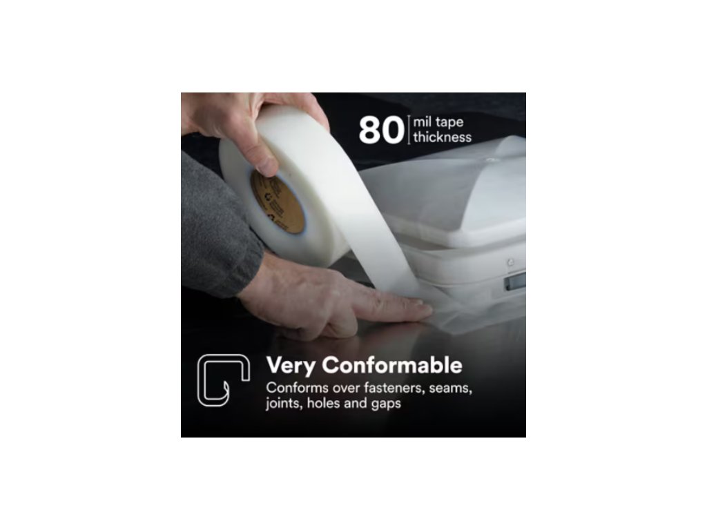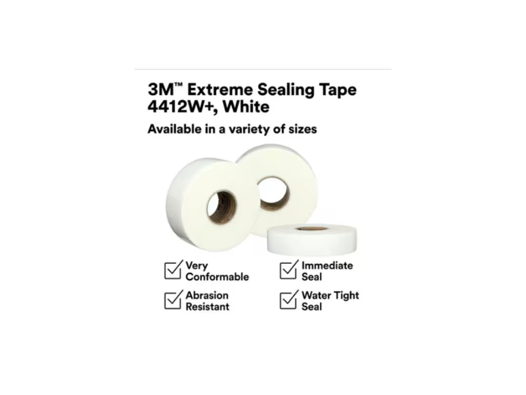 3M Extreme Sealant Tape 4412W+ je biela, vysoko prispôsobivá, jednostranná, na tlak citlivá akrylová lepiaca páska s podkladom z TPO. Je ideálnym riešením na vytvorenie vodotesného tesnenia. Prispôsobí sa spojovacím prvkom, švom, spojom, otvorom a medzerám a poskytuje dlhotrvajúce tesnenie na rôznych podkladoch.