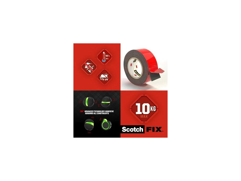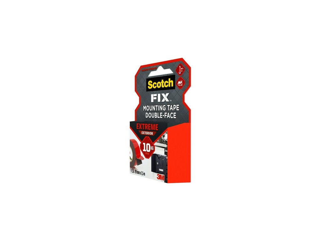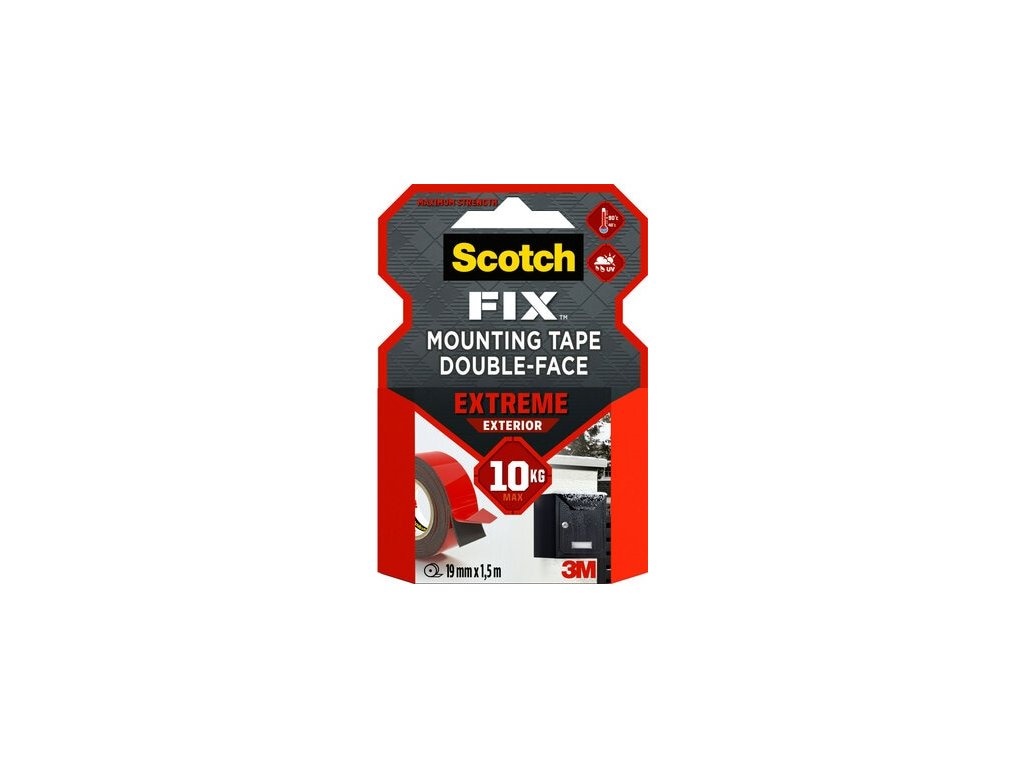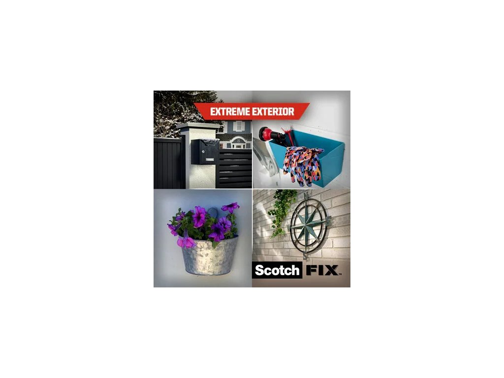 Montážna páska Scotch-Fix™ Extreme pre vonkajšie použitie s najnovšou technológiou od spoločnosti 3M™. Táto vysokokvalitná prispôsobivá permanentná páska má nosnosť až 10 kg a je určená na vonkajšie použitie a do extrémnych podmienok. Je ideálna na maľované sadrokartónové dosky, maľované/hladké drevo, kov, akryl, hladký kameň a maľovaný betón.