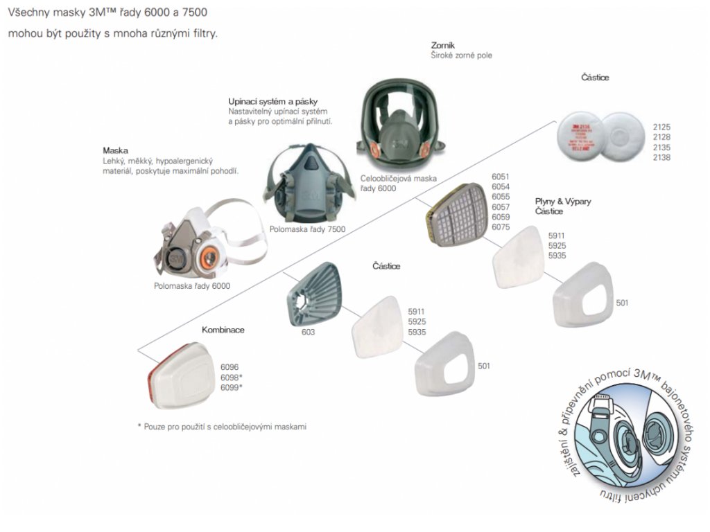 - Bajonetový systém upínania filtrov 3M na bezpečné a spoľahlivé upevnenie filtra.