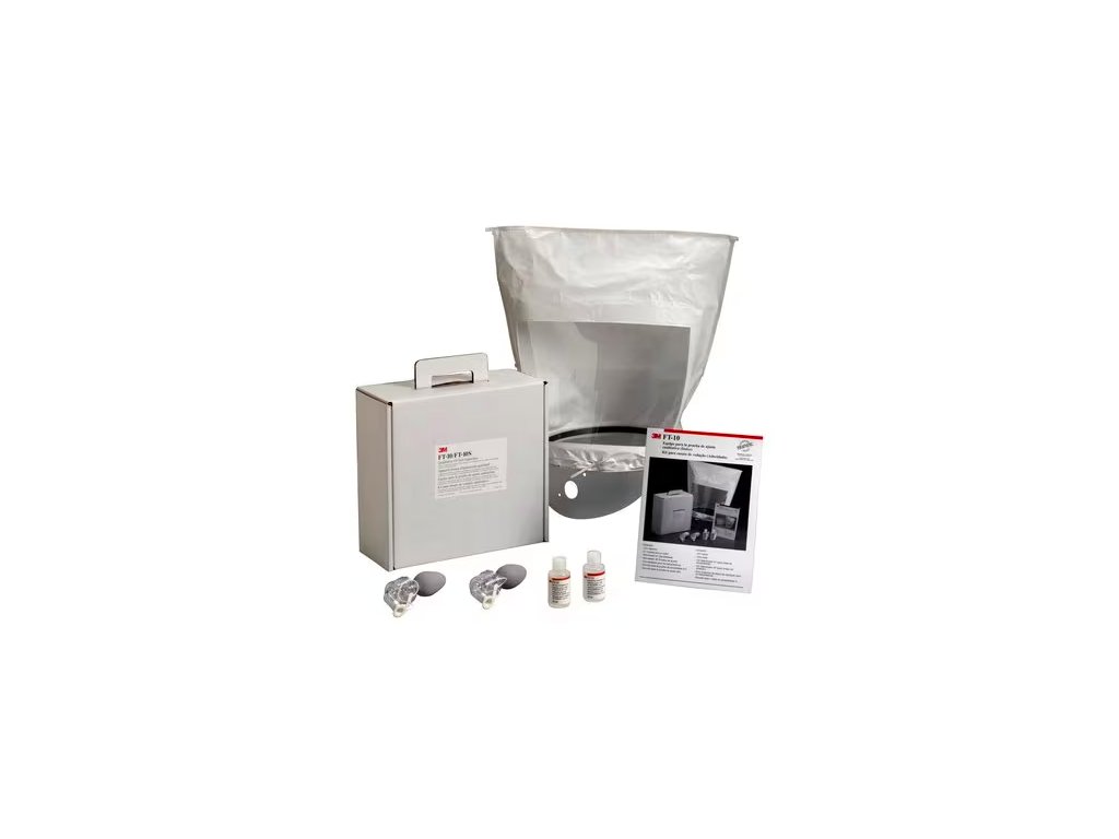 Súprava 3M™ Sweet Fit Test Kit FT-10 obsahuje kuklu, golier, 2 rozprašovače, roztok na testovanie citlivosti, testovací roztok a laminovaný návod.